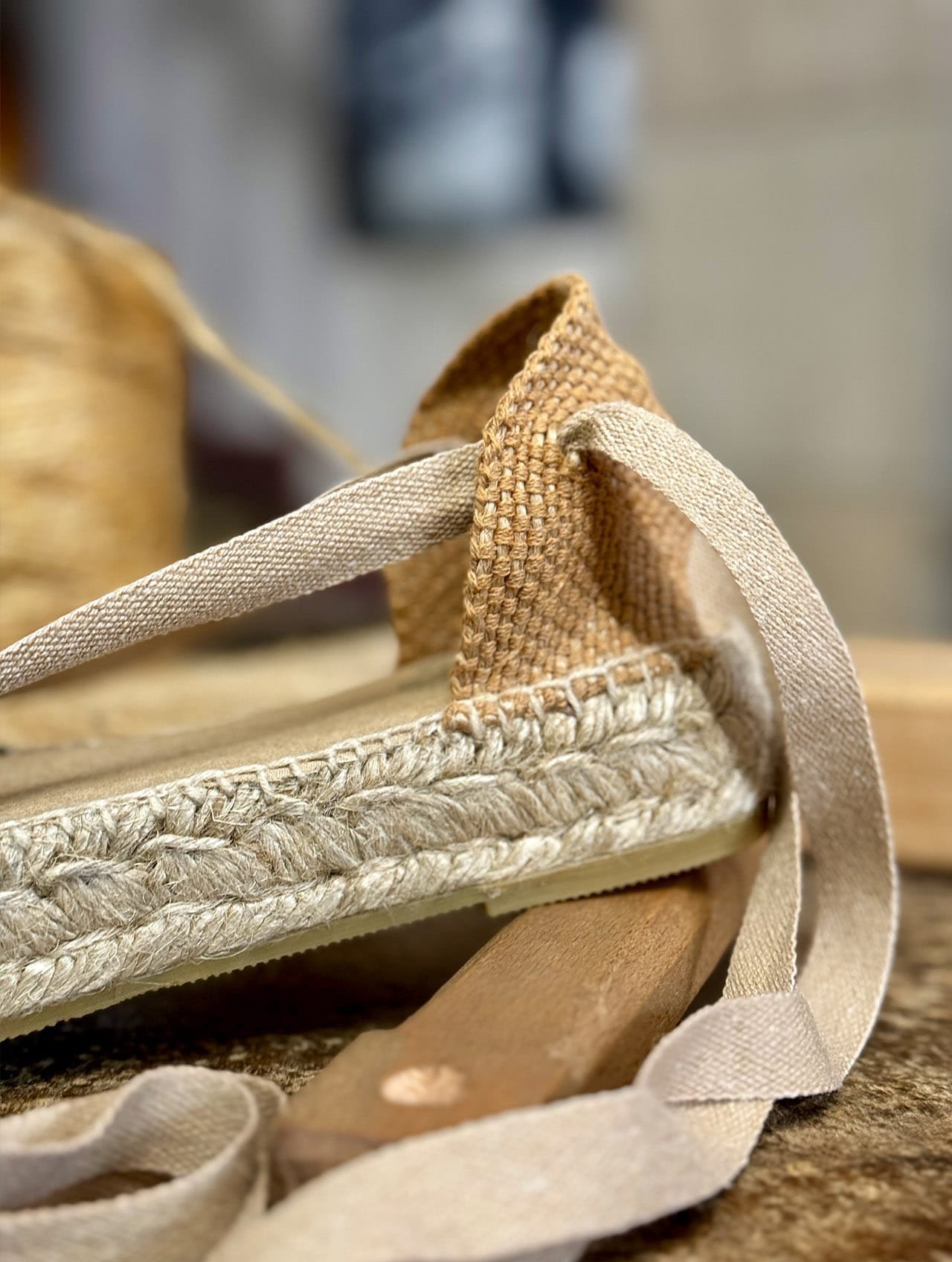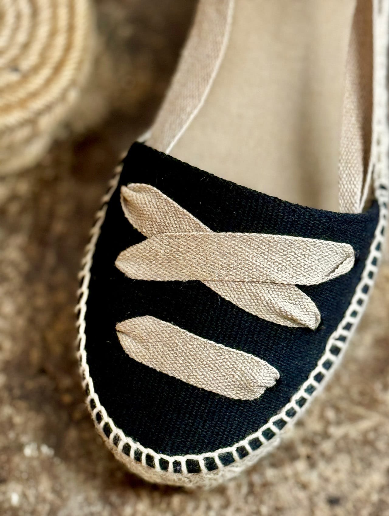 Una alpargata de mujer exclusiva de La Manual Alpargatera, vegana y que sólo contiene materiales naturales como el yute y el caucho en las suelas.