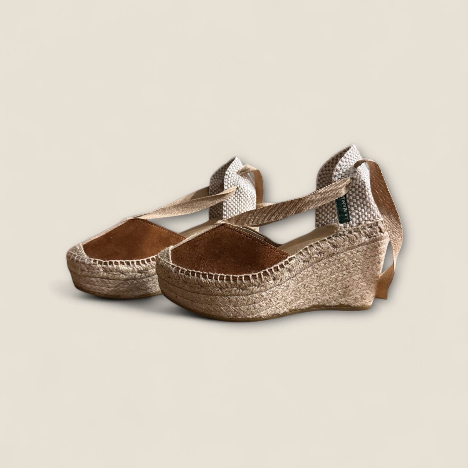 Su diseño, elaborado en ante marrón de alta calidad, resalta la belleza de los materiales naturales y se adapta con suavidad al pie. La plataforma de yute trenzado, cosida con puntadas de festón, eleva la silueta sin renunciar al confort.