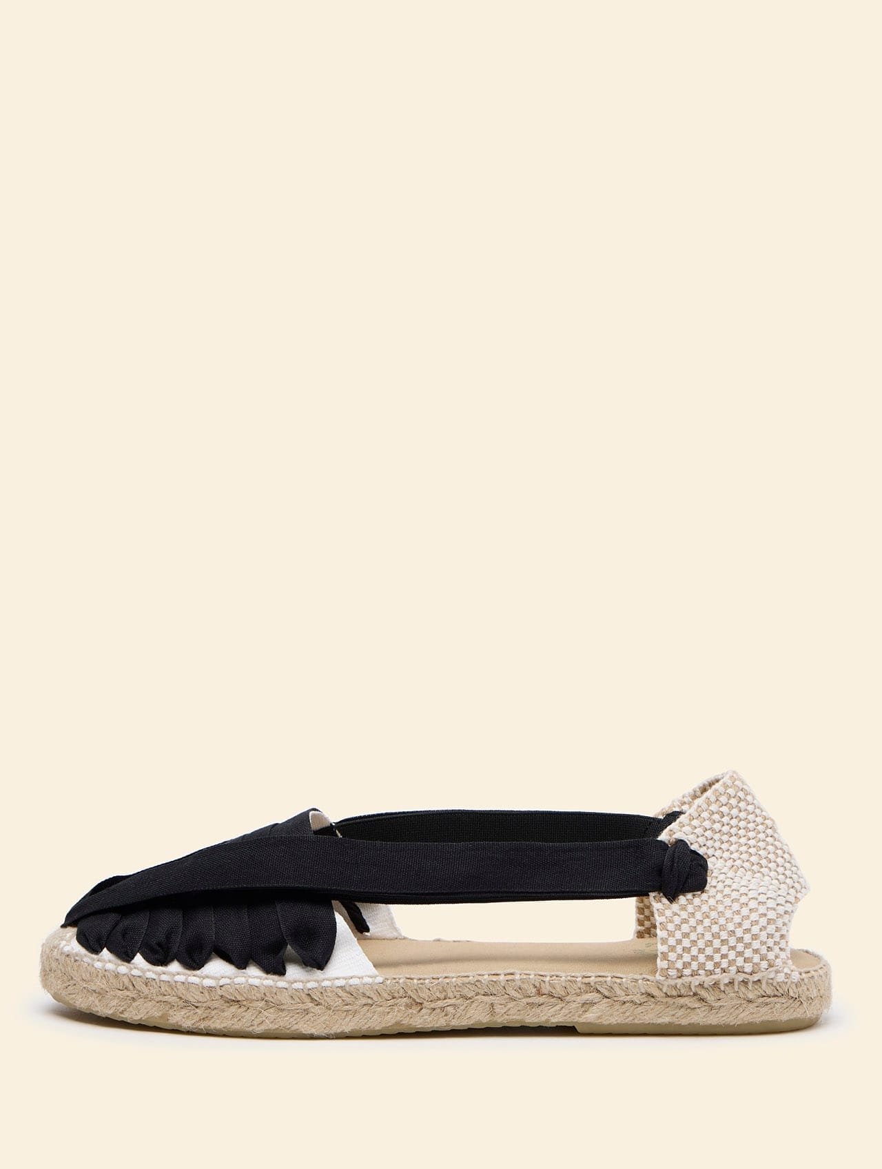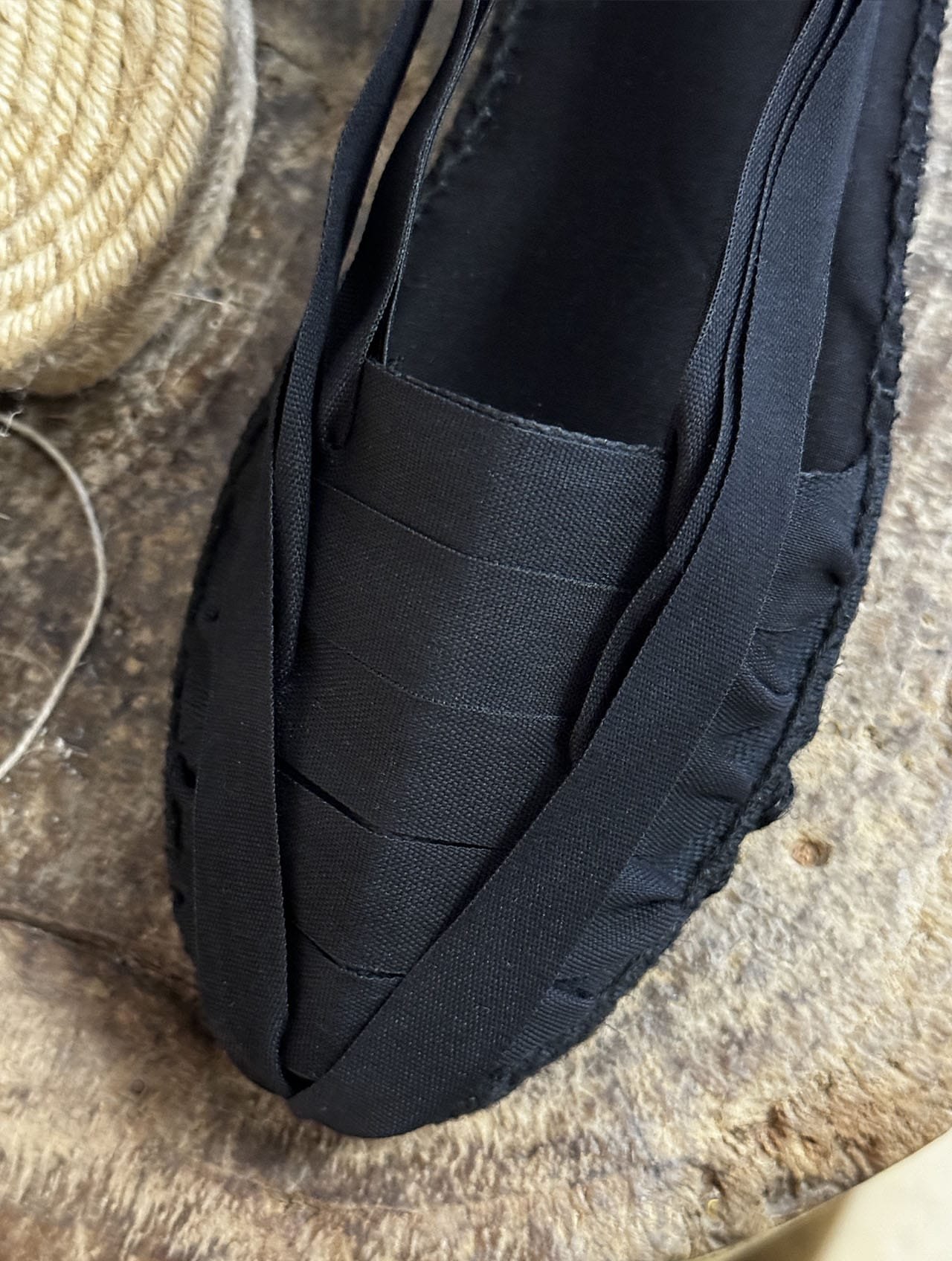 La alpargata tradicional, con elástico en el lateral. Modelo favorito de Salvador Dalí simplificado, que las combinaba incluso con esmoquin. Calzado ligero, plantilla de yute con cintas de algodón. Suela vulcanizada. Diseño de La Manual Alpargatera Barcelona.